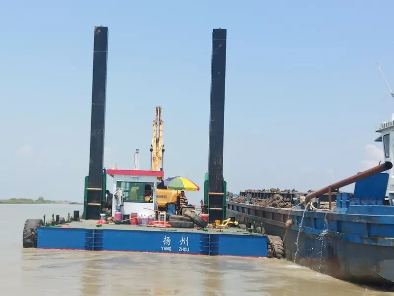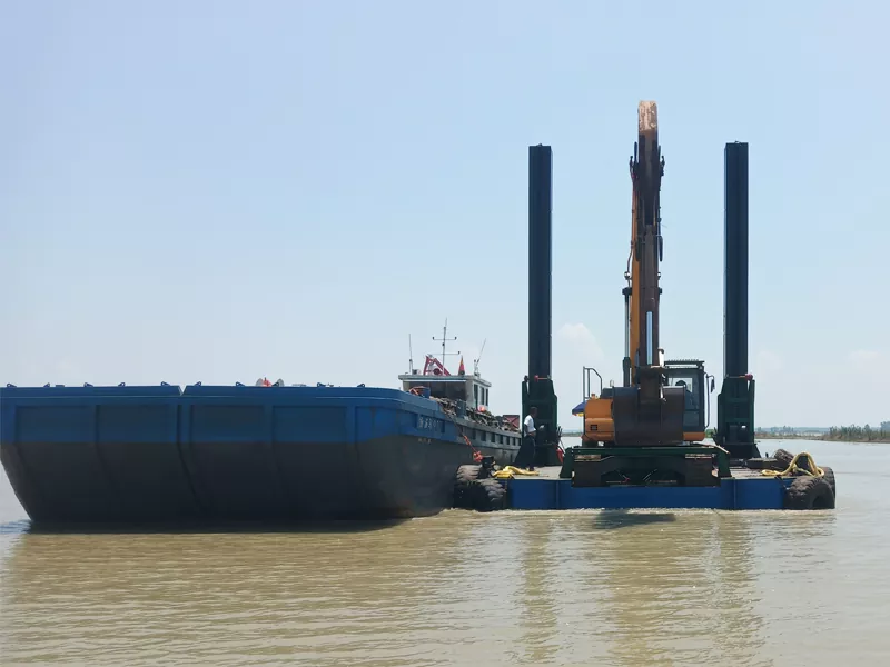 A: Het River Excavator Platform kan met de arm van de graafmachine over korte afstanden worden verplaatst of worden uitgerust met optionele hydraulische spudpalen en voortstuwingssystemen voor nauwkeurige positionering bij rivierontzandingsprojecten.